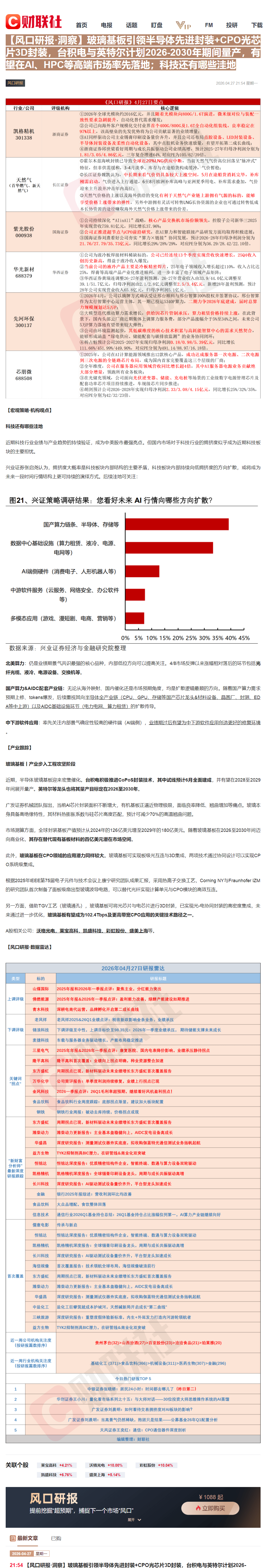 CLSMA to 财联社 10合一 实时滚动更新中文 · 3 hours ago21:54【风口研报·洞察】玻璃基板引领半导体先进封装+CPO光芯片3D封装,台积电与英特尔计划2026-2030年期间量产,有望在AI、HPC等高端市场率先落地;科技还有哪些洼地imagemessage-square0linkfedilinkarrow-up11arrow-down10