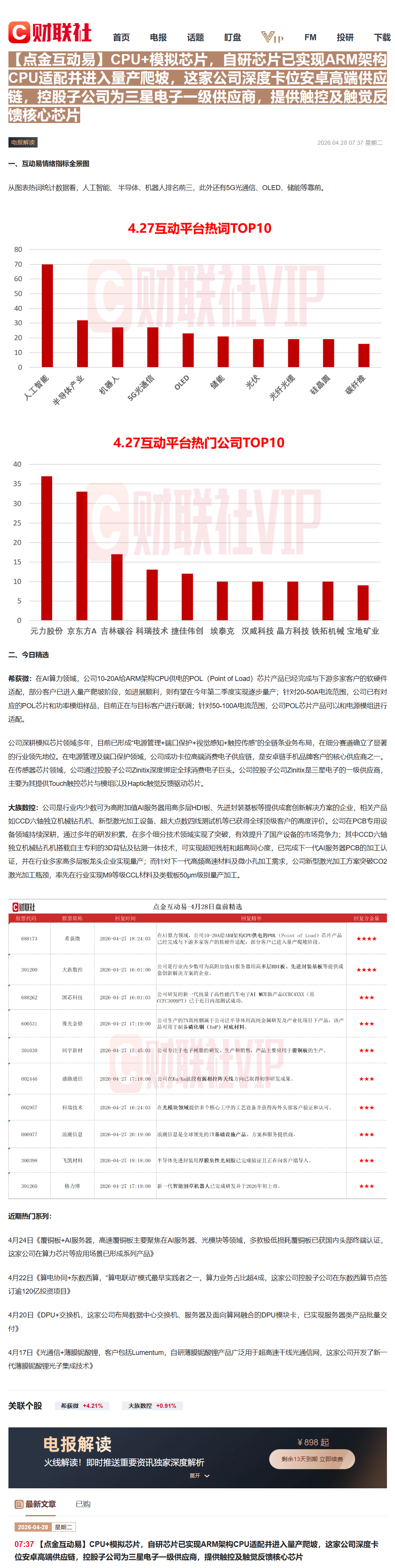 CLSMA to 财联社 10合一 实时滚动更新中文 · 4 hours ago07:37【点金互动易】CPU+模拟芯片,自研芯片已实现ARM架构CPU适配并进入量产爬坡,这家公司深度卡位安卓高端供应链,控股子公司为三星电子一级供应商,提供触控及触觉反馈核心芯片imagemessage-square0linkfedilinkarrow-up11arrow-down10