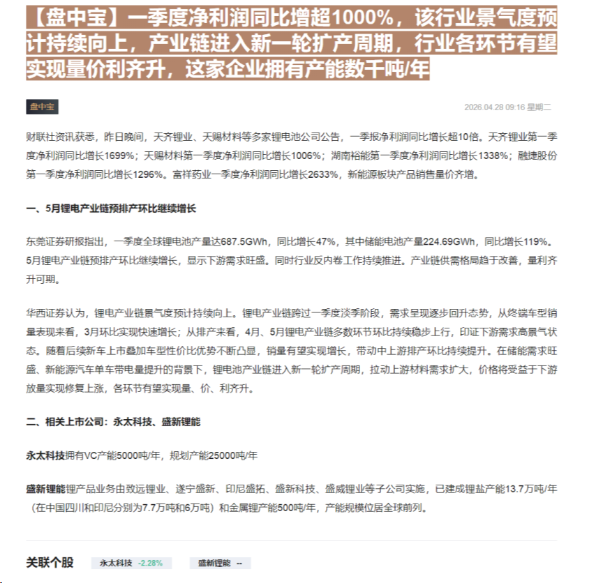 CLSMA to 财联社 10合一 实时滚动更新中文 · 2 hours ago09:16【盘中宝】一季度净利润同比增超1000%,该行业景气度预计持续向上,产业链进入新一轮扩产周期,行业各环节有望实现量价利齐升,这家企业拥有产能数千吨/年imagemessage-square0linkfedilinkarrow-up11arrow-down10