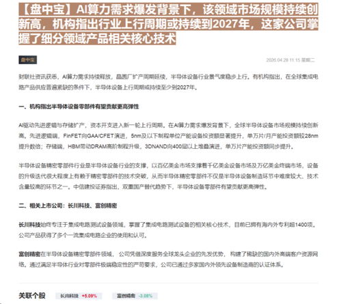 CLSMA to 财联社 10合一 实时滚动更新中文 · 2 hours ago11:15【盘中宝】AI算力需求爆发背景下,该领域市场规模持续创新高,机构指出行业上行周期或持续到2027年,这家公司掌握了细分领域产品相关核心技术imagemessage-square0linkfedilinkarrow-up11arrow-down10