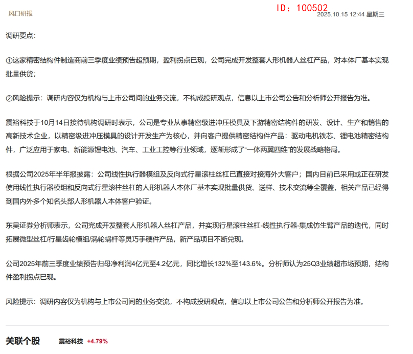 CLSMA to 财联社 10合一 实时滚动更新中文 · 6 days ago12:44 【机构调研】这家公司完成开发整套人形机器人丝杠产品,前三季度业绩预告超预期imagemessage-square0linkfedilinkarrow-up11arrow-down10