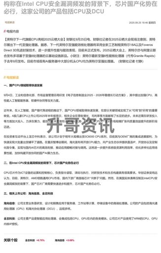 CLSMA to 财联社 10合一 实时滚动更新中文 · 26 days ago18:46【电报解读】英特尔下一代旗舰CPU亮相2025云栖大会!机构称在Intel CPU安全漏洞频发的背景下,芯片国产化势在必行,这家公司的产品包括CPU及DCUimagemessage-square0linkfedilinkarrow-up11arrow-down10