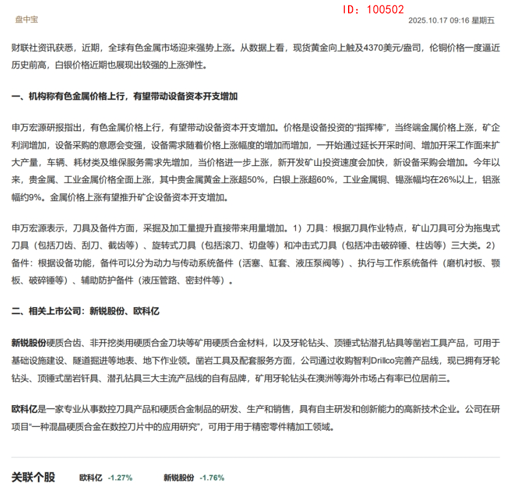 09:16 【盘中宝】贵金属、工业金属价格全面上涨,机构称有望推升该细分领域资本开支增加,进而带来相关产品用量增加,这家企业细分产品海外市占率位居前列