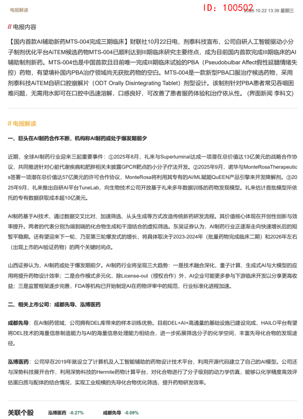 CLSMA to 财联社 10合一 实时滚动更新中文 · 10 hours ago13:39 【电报解读】国内首款AI辅助新药完成三期临床,机构称AI制药或处于爆发期前夕,这家公司AI+高通量基础设施已建设完成imagemessage-square0linkfedilinkarrow-up11arrow-down10