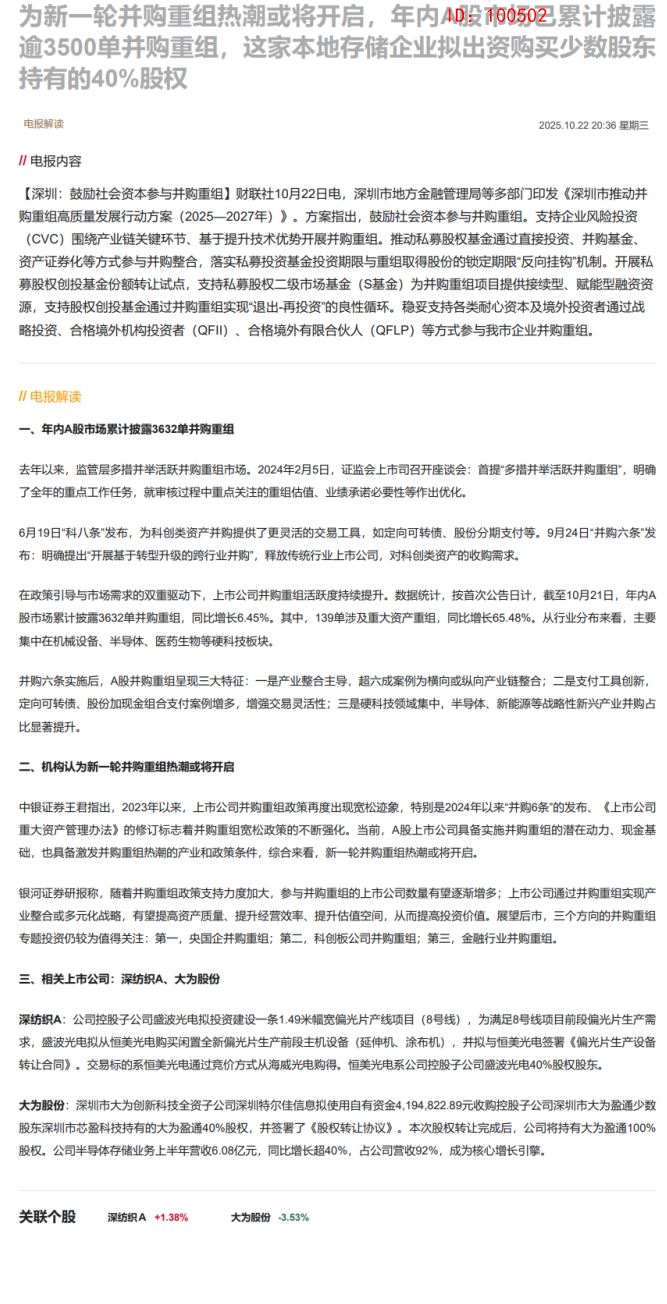 CLSMA to 财联社 10合一 实时滚动更新中文 · 9 hours ago20:36 【电报解读】深圳发文鼓励社会资本参与并购重组,机构认为新一轮并购重组热潮或将开启,年内A股市场已累计披露逾3500单并购重组,这家本地存储企业拟出资购买少数股东持有的40%股权imagemessage-square0linkfedilinkarrow-up11arrow-down10
