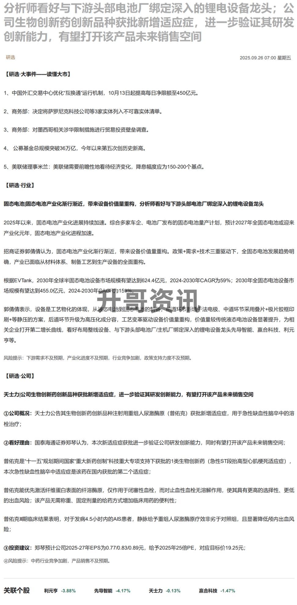 07:00【研选】固态电池产业化渐行渐近,带来设备价值量重构,分析师看好与下游头部电池厂绑定深入的锂电设备龙头;公司生物创新药创新品种获批新增适应症,进一步验证其研发创新能力,有望打开该产品未来销售空间