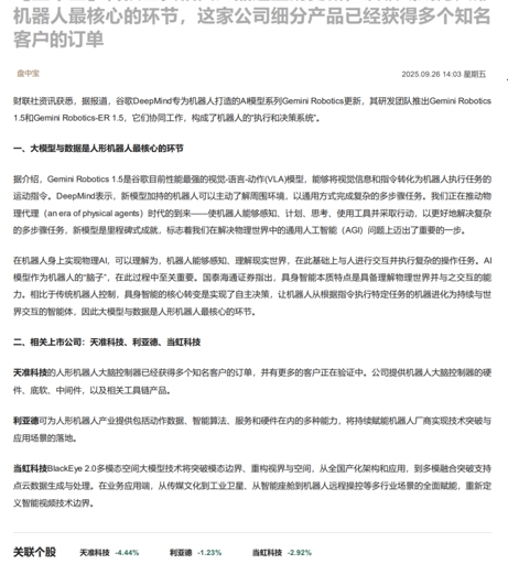 CLSMA to 财联社 10合一 实时滚动更新中文 · 24 days ago14:03【盘中宝】科技巨头相关产品迎重磅更新,该领域或为人形机器人最核心的环节,这家公司细分产品已经获得多个知名客户的订单imagemessage-square0linkfedilinkarrow-up11arrow-down10