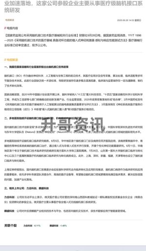 14:03【电报解读】我国发布脑机接口医疗器械标准,机构看好产业加速落地,这家公司参股企业主要从事医疗级脑机接口系统研发