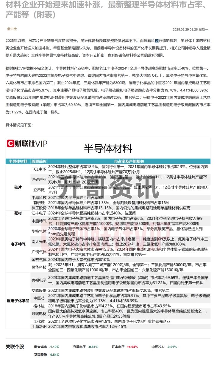 CLSMA to 财联社 10合一 实时滚动更新中文 · 21 days ago08:26 【盘中宝·数据】AI芯片产业链景气度持续提升,半导体上游材料企业开始迎来加速补涨,最新整理半导体材料市占率、产能等(附表)imagemessage-square0linkfedilinkarrow-up11arrow-down10