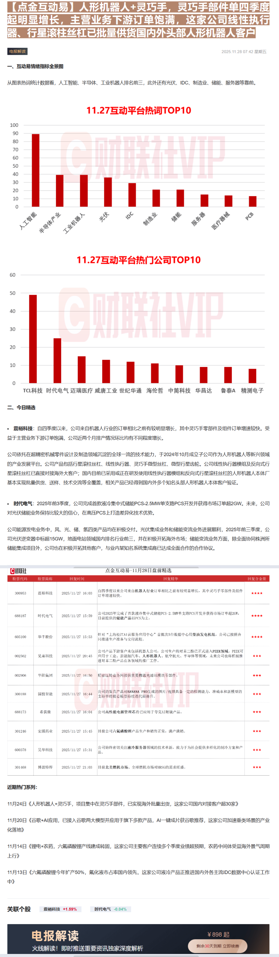 arrow-up11arrow-down1image07:42【点金互动易】人形机器人+灵巧手,灵巧手部件单四季度起明显增长,主营业务下游订单饱满,这家公司线性执行器、行星滚柱丝杠已批量供货国内外头部人形机器人客户CLSMA to 财联社 10合一 实时滚动更新中文 · 3 days agomessage-square0linkfedilink