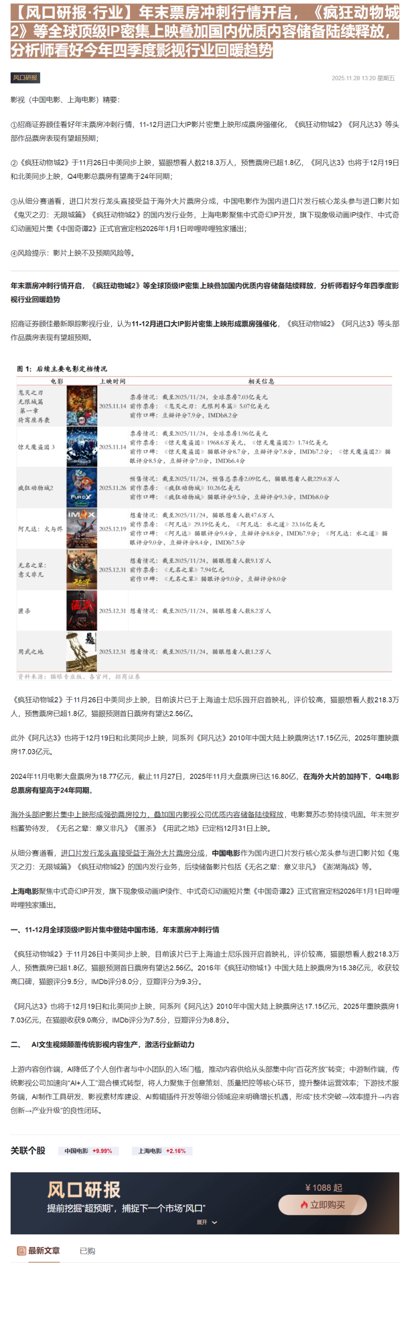 CLSMA to 财联社 10合一 实时滚动更新中文 · 3 days ago13:20【风口研报·行业】年末票房冲刺行情开启,《疯狂动物城2》等全球顶级IP密集上映叠加国内优质内容储备陆续释放,分析师看好今年四季度影视行业回暖趋势imagemessage-square0linkfedilinkarrow-up11arrow-down10