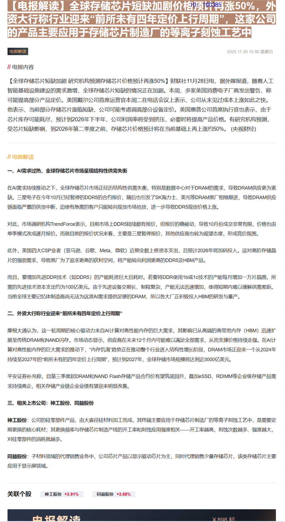 CLSMA to 财联社 10合一 实时滚动更新中文 · 9 hours ago15:00【电报解读】全球存储芯片短缺加剧价格预计再涨50%,外资大行称行业迎来“前所未有四年定价上行周期”,这家公司的产品主要应用于存储芯片制造厂的等离子刻蚀工艺中imagemessage-square0linkfedilinkarrow-up11arrow-down10